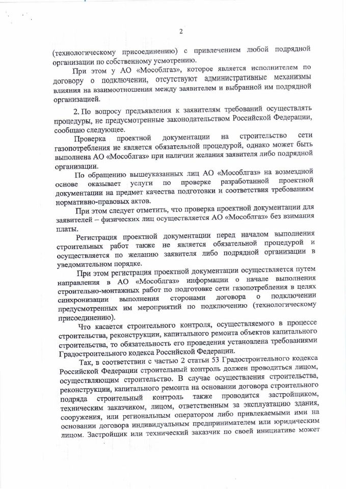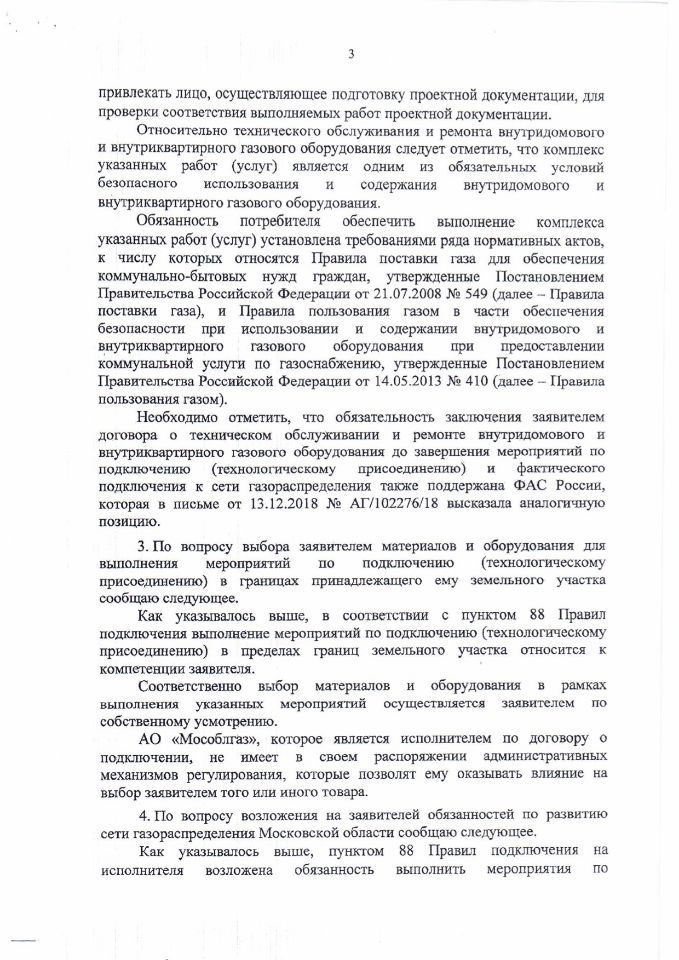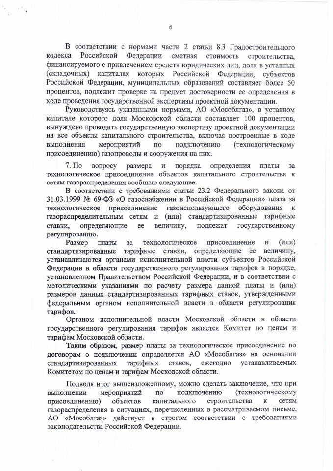 Подводя итог вышеизложенному, можно сделать заключение, что при выполнении мероприятий по подключению (технологическому присоединению) объектов капитального строительства к сетям газораспределения в ситуациях, перечисленных в рассматриваемом письме, АО «Мособлгаз» действует в строгом соответствии с требованиями законодательства Российской Федерации.