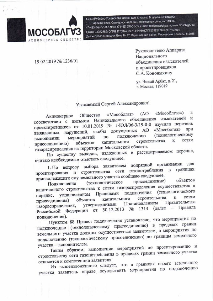 Акционерное Общество «Мособлгаз» (АО «Мособлгаз») в соответствии с письмом Национального объединения изыскателей и проектировщиков от 10.01.2019 N 1-ЮЛ/06-3/19-0-О изучило перечень выявленных нарушений, якобы допущенных АО «Мособлгаз» при выполнении мероприятий по подключению (технологическому присоединению) объектов капитального строительства к сетям газораспределения на территории Московской области.